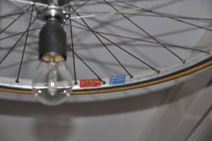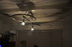 Lichtfiets Lamp met twee wielen en mooie schaduwwerking tegen het plafond. UpCycle your life kunst. decreatievelink upcycle your life art & design. wielrennen. wereldkampioenschap. Bergen 2017.