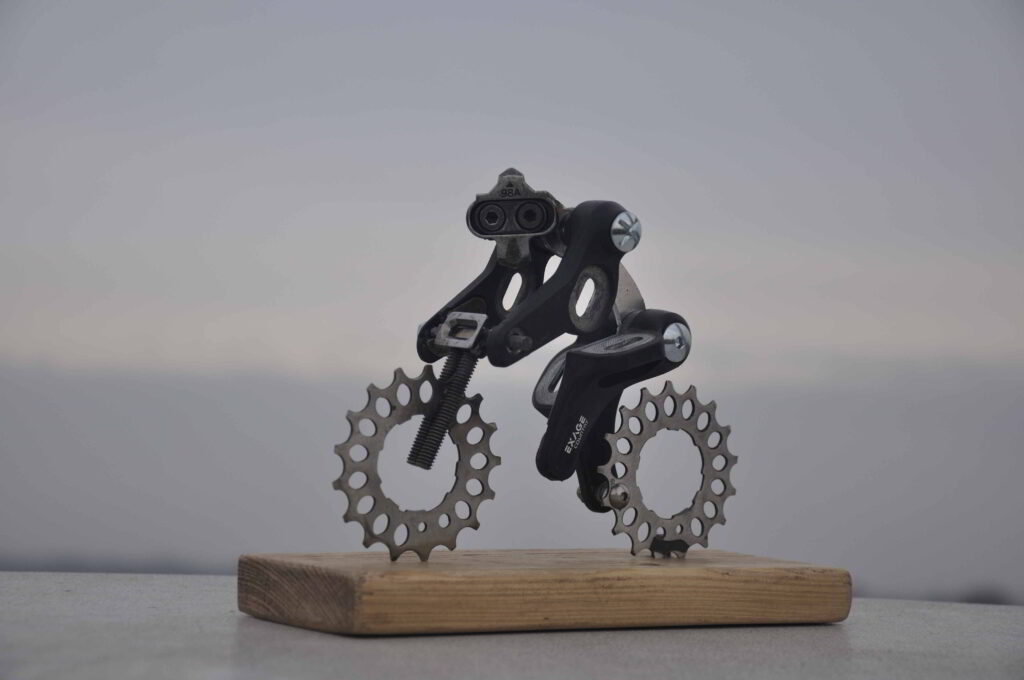 Mountainbiker modello 4, scultura unica realizzata con vecchi componenti di biciclette su legno. Dimensioni: 22x16x8 cm. Da vedere e acquistare al Mountainbike museum Arnhem o da ordinare tramite cyclingartisthubert@gmail.com al prezzo di 150 euro.